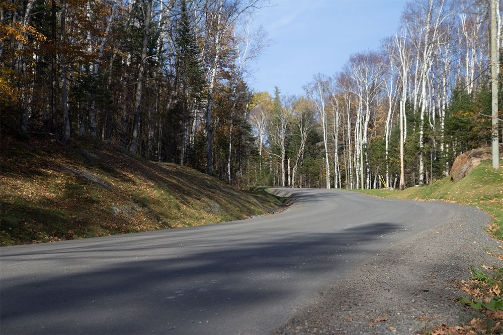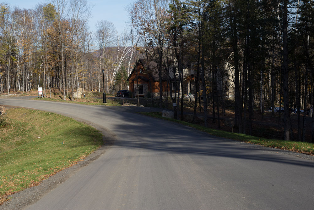Lors de la configuration des lots, nous avons porté une attention particulière au respect des bandes riveraines des milieux écologiques. De plus, le promoteur nous a demandé de conserver au maximum le milieu naturel (arbres matures). Également, les travaux ayant lieu sur un terrain en montagne avec de fortes pentes et où le roc est très près de la surface, nous avons dû user de notre imagination pour limiter les coûts de construction. Nous avons aussi accordé une grande importance au système de gestion des eaux pluviales afin de minimiser le ruissellement puisque la capacité des infrastructures en aval était limitée. Le concept retenu fût un système de tranchée drainante pour capter les pluies courantes doublée d’un réseau de conduite et d’un bassin de rétention pour gérer les pluies plus intenses.