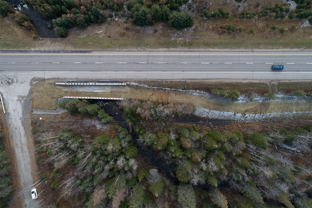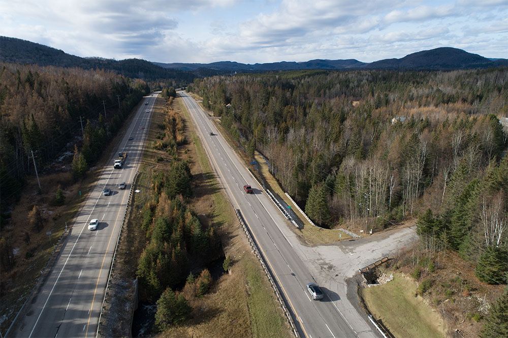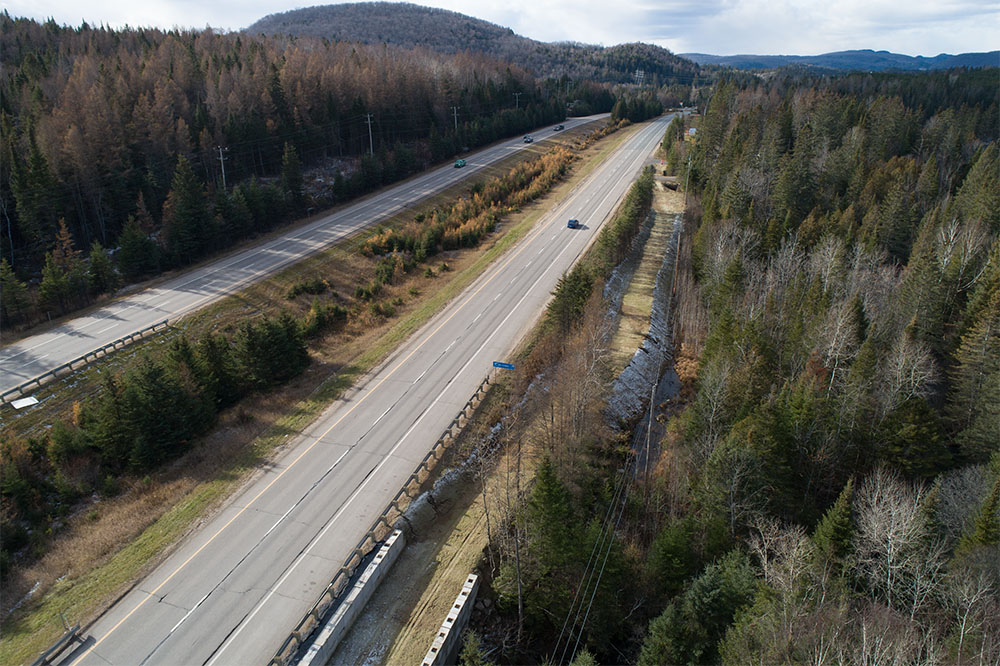 Dans les Laurentides, Équipe Laurence a collaboré avec le Club de motoneiges Diable et Rouge pour concevoir et réaliser un sentier de motoneiges d’environ 9 km longeant la route 117, entre Saint-Faustin-Lac-Carré et Mont-Tremblant. Ce projet ambitieux a nécessité une planification minutieuse pour intégrer le tracé dans un environnement naturel composé de zones boisées, de reliefs accidentés et de milieux humides. En plus du sentier, trois ponts en acier et bois, pouvant atteindre 22 mètres de longueur, ont été conçus en partenariat avec DWB Consultants. Les travaux comprenaient le déboisement, le déblai/remblai, la mise en place de glissières de sécurité, des murs de soutènement et des ouvrages d’art pour canaliser les cours d’eau.